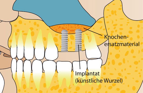 In der Implantologie wird ein Knochenaufbau durchgeführt, um Patienten die Versorgung mit implantatgetragenem Zahnersatz zu ermöglichen, wenn ihr Kieferknochen nicht die nötigen Voraussetzungen bietet.